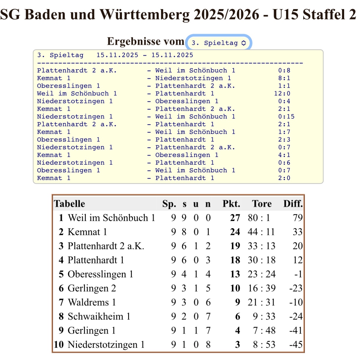 Damit behaupten sie zur Saisonhälfte, mit 9 Siegen in 9 Spielen und 80:1 Toren, die Tabellenführung, dicht gefolgt von Kemnat1.
