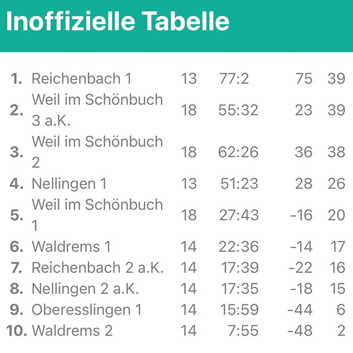 Weil3 a.K. (Mika Holzmüller & Max Schütz) konnte gegen Weil1 (3:1), Oberesslingen1 (2:0), Waldrems1 (5:0) und Waldrems2 (3:0) ebenfalls überzeugen und unterlag Weil2 nur knapp mit 1:3. Damit endet für Mika und Max als „außer Konkurrenz“-Team die laufende U13-Saison mit 55:32 Treffern und aktuell punktgleich mit 39 Zählern mit dem Spitzenreiter Reichenbach1 auf Rang 2 der inoffiziellen Tabelle (incl. a.K.-Teams). Nur Nellingen1 könnte ihnen den zweiten Rang noch streitig machen.