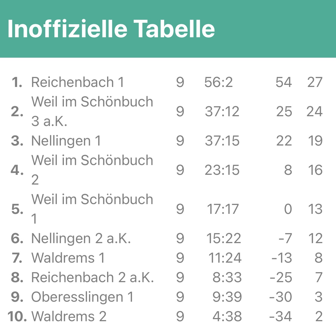 Am zweiten Spieltag durfte der RV-Weil neben Nellingen2 a.K. auch die beiden Führenden der laufenden Verbandstaffel Reichenbach1 und Nellingen1 begrüßen, Reichenbach2 a.K. musste krankheitsbedingt leider absagen (diese Spiele wurden jeweils entsprechend mit 5:0 für die Weiler Teams gewertet).