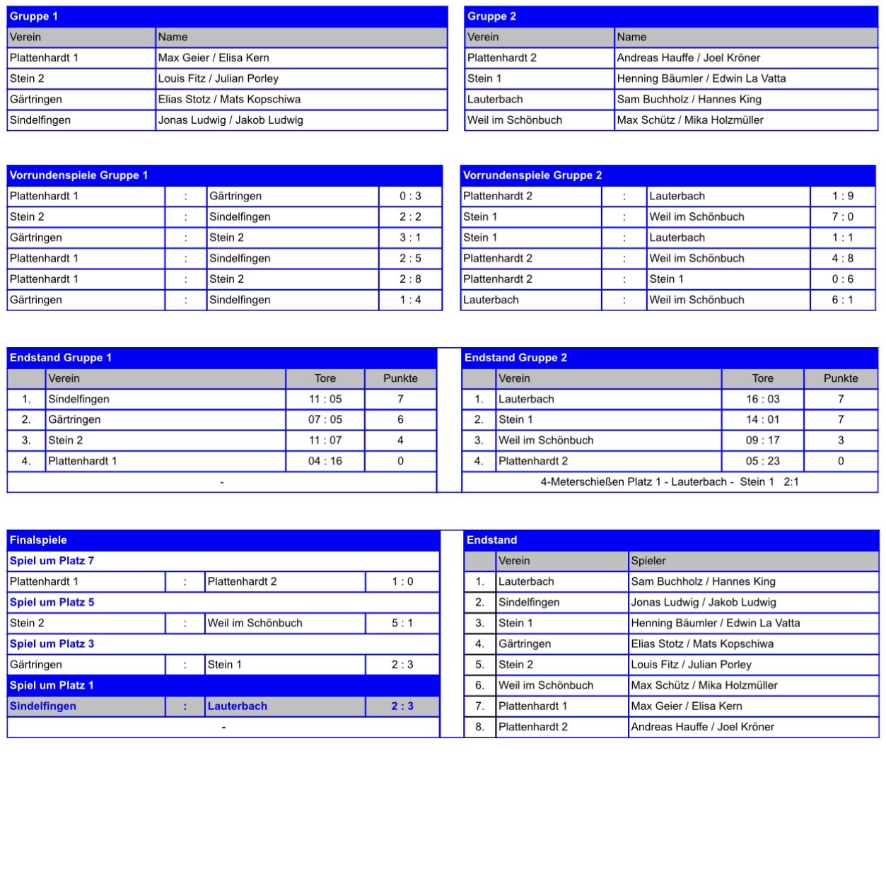 Eine überragende Leistung zeigten Jan Sauter und Toni Lischke - sie konnten alle Vorrundenspiele mit in Summe 15:0 Toren für sich entscheiden und bezwangen in einem packenden Finale sogar das Spitzenteam aus Bonlanden mit 1:0, was ihnen den ersten Turniersieg einbrachte.