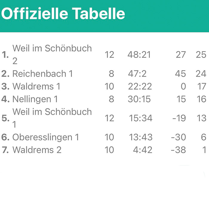 Weil3 a.K. (Mika Holzmüller & Max Schütz) konnte gegen Weil1 (3:1), Oberesslingen1 (2:0), Waldrems1 (5:0) und Waldrems2 (3:0) ebenfalls überzeugen und unterlag Weil2 nur knapp mit 1:3. Damit endet für Mika und Max als „außer Konkurrenz“-Team die laufende U13-Saison mit 55:32 Treffern und aktuell punktgleich mit 39 Zählern mit dem Spitzenreiter Reichenbach1 auf Rang 2 der inoffiziellen Tabelle (incl. a.K.-Teams). Nur Nellingen1 könnte ihnen den zweiten Rang noch streitig machen.